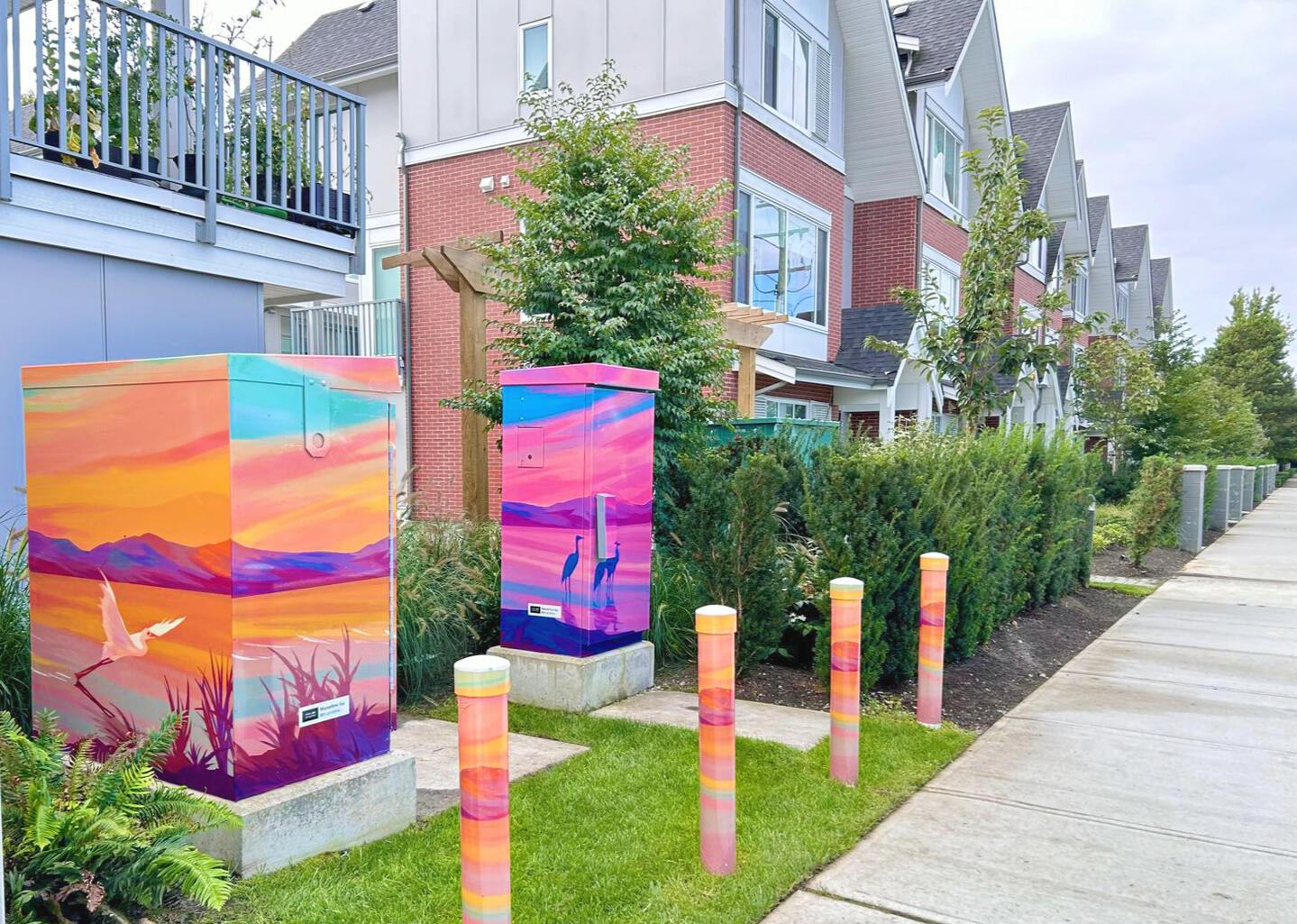 ‘from dawn to dusk is inspired by memories of my childhood in Richmond going on walks along the West Dyke trail. The artwork features one of the animals I most associate with the City of Richmond – the Pacific Great Blue Heron, occasionally spotted on the shores of the river. Using these early experiences as reference, the work merges memories of exploring the natural environment with recollections of encountering local wildlife throughout my years growing up in Richmond.part of the City of Richmond Traffic Cabinet public art series
